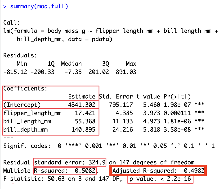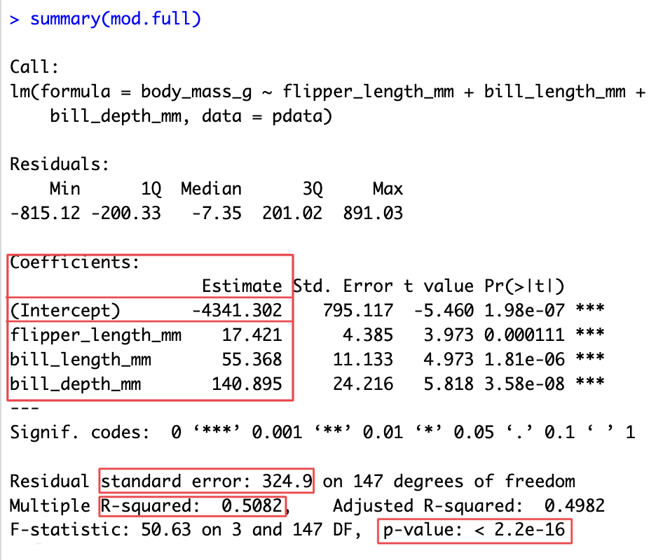 mod.full <- lm(body_mass_g ~ flipper_length_mm + bill_length_mm + bill_depth_mm, data=pdata)