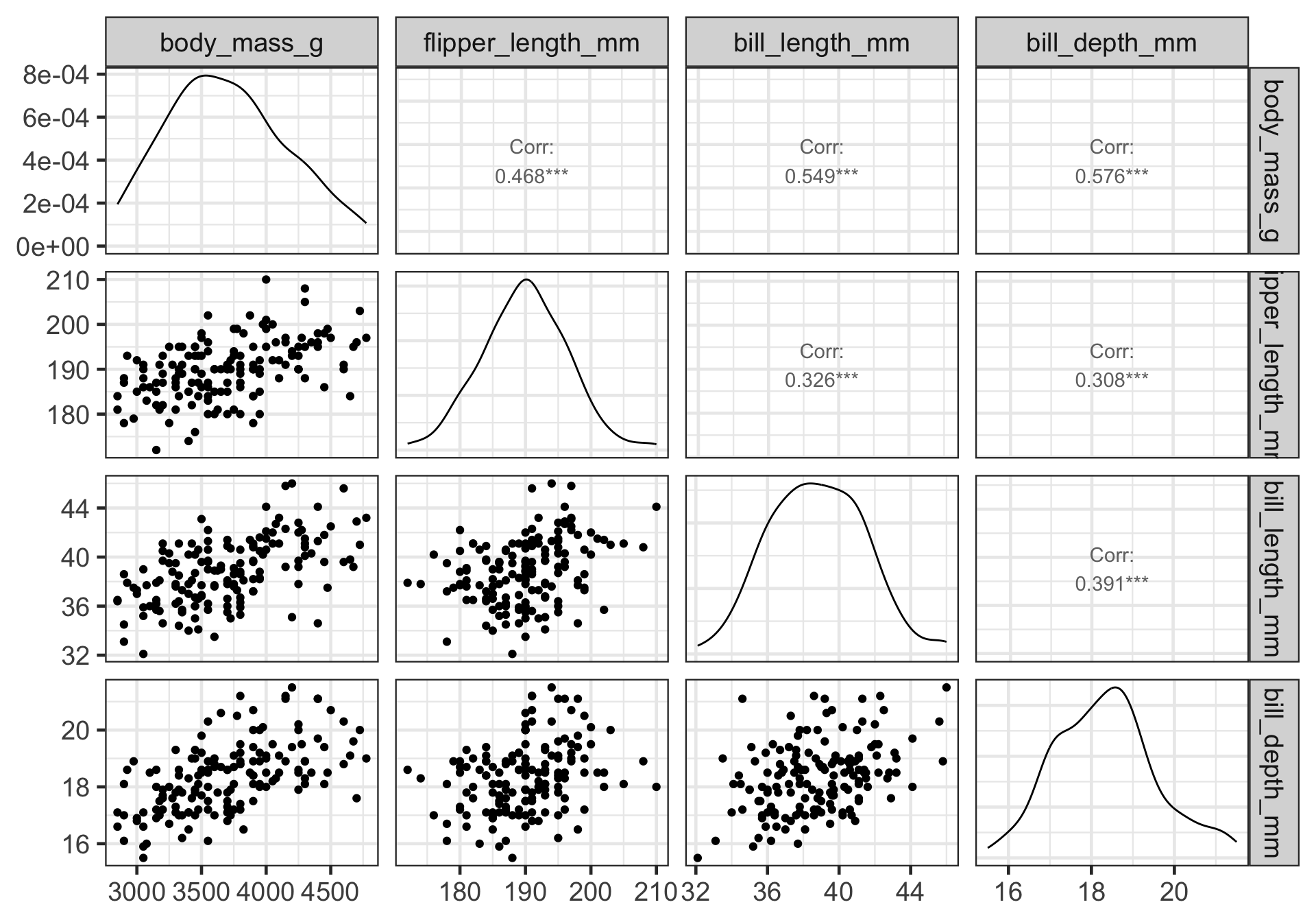 select(body_mass_g, flipper_length_mm, bill_length_mm, bill_depth_mm) %>%