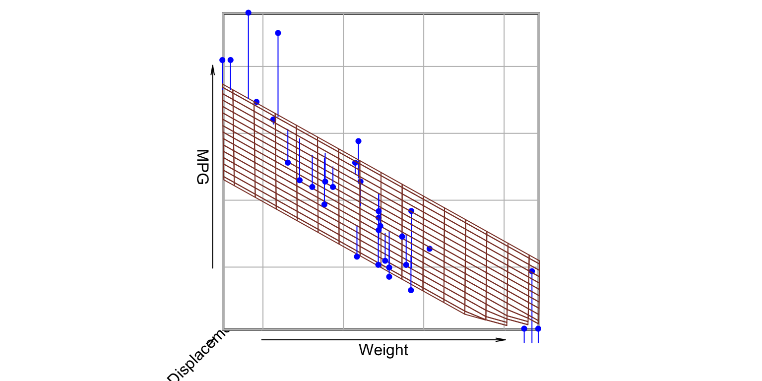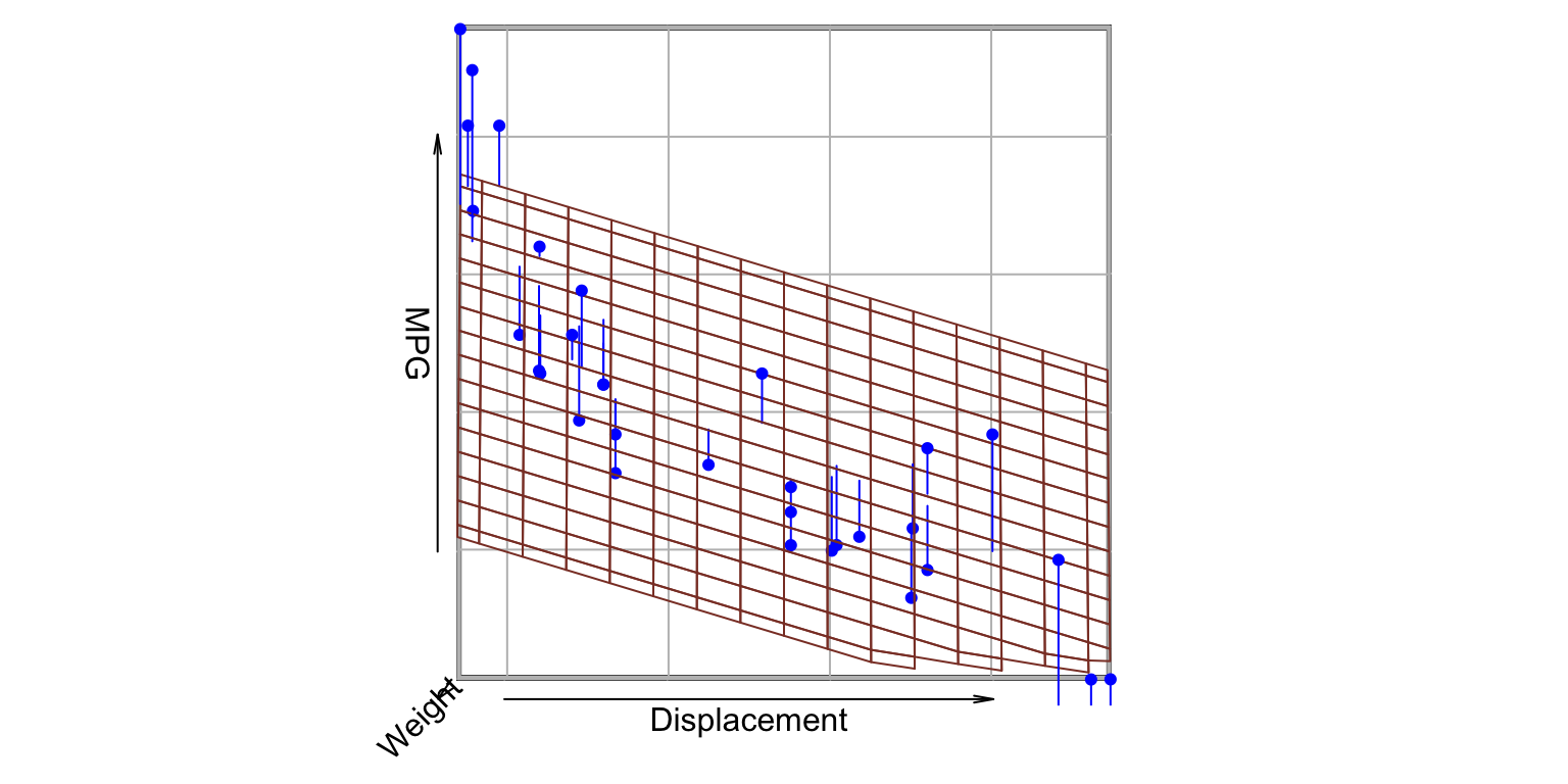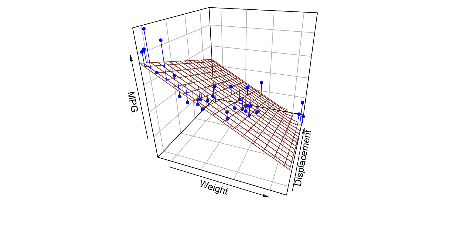 MPG ~ Weight + Displacement (using the mtcars built-in dataset)MPG ~ Weight + DisplacementMPG ~ Weight + DisplacementMPG ~ Weight + DisplacementY_{i} = \beta_{0} + \displaystyle\sum_{k=1}^{K} \left( \beta_{k} X_{ik} \right) +\varepsilon_{i} - sorry! I can’t draw in > 3 dimensions