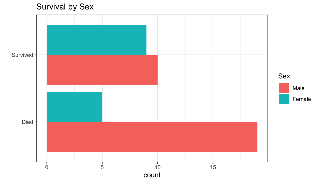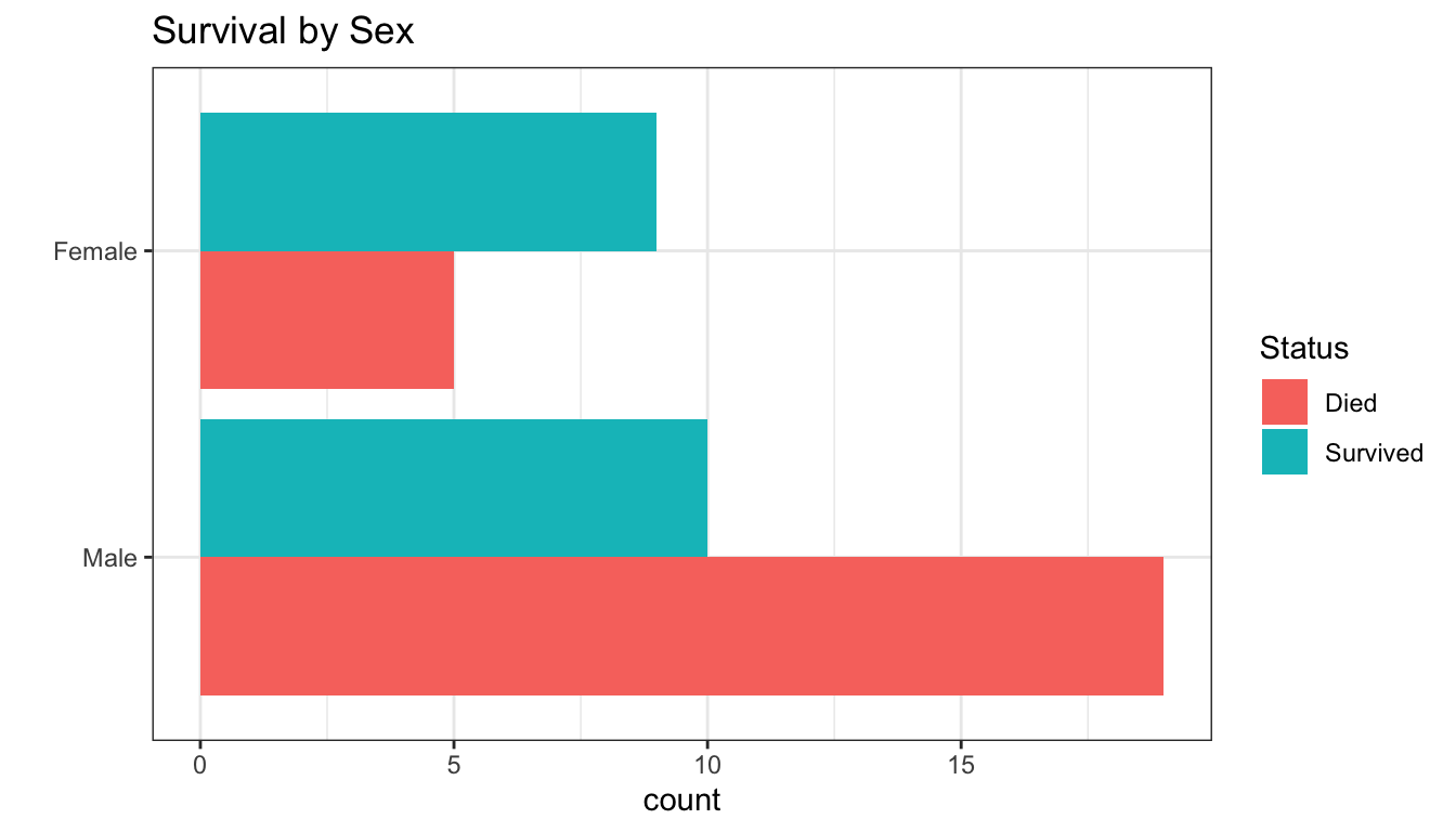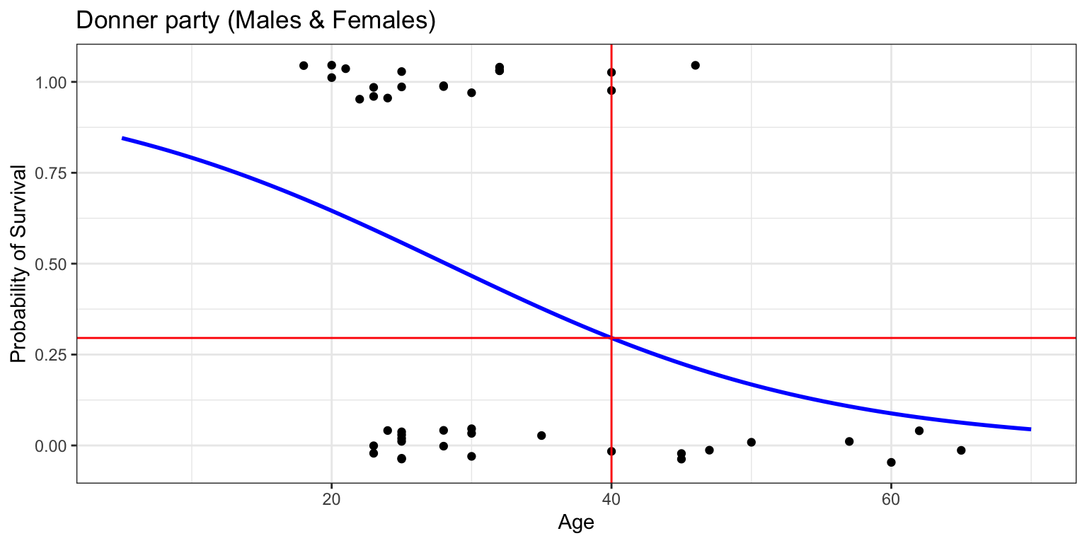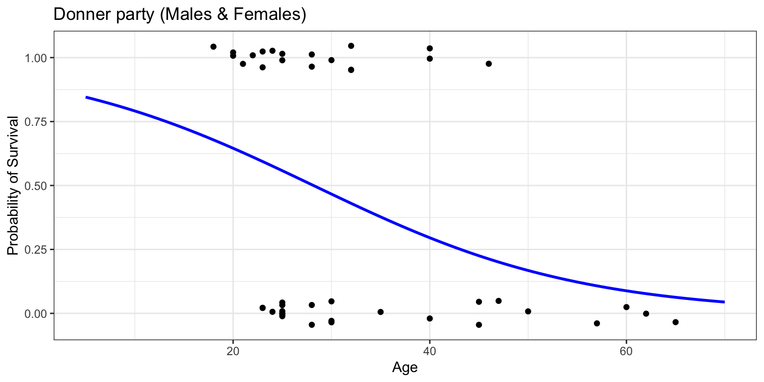 labs(title="Donner party (Males & Females)", y="Probability of Survival") +