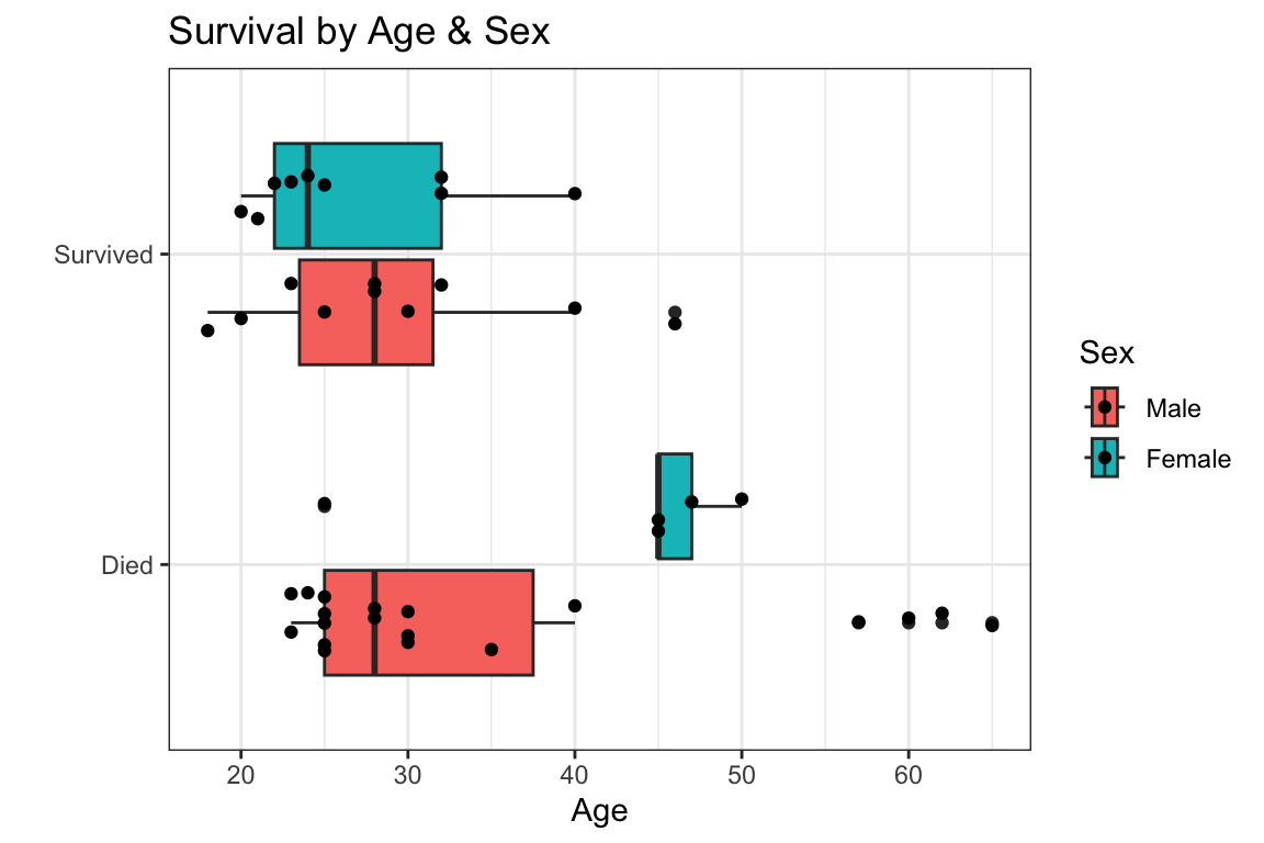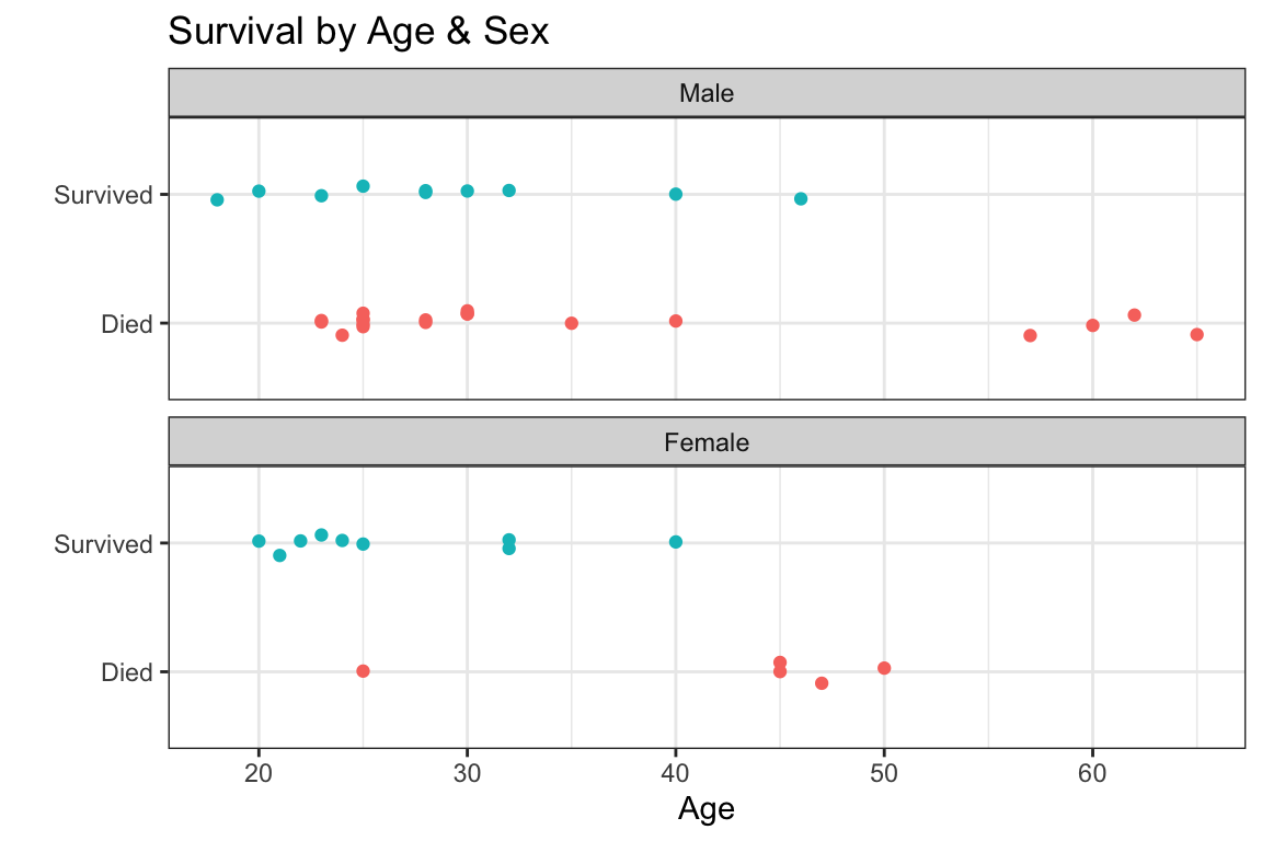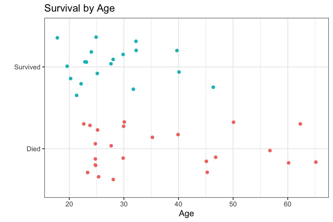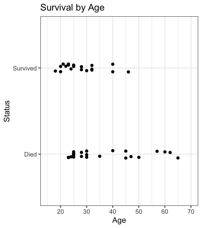 $ Status <fct> Died, Survived, Survived, Died, Died, Died, Died, Died, Died, D…Status (binary outcome: Survived vs Died) as a function of Age (continuous variable)donner %>%