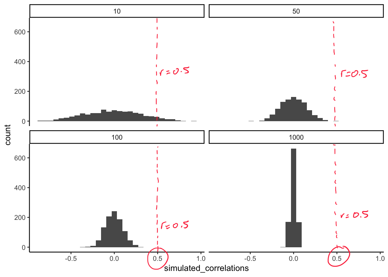 Alternative Hypothesis H_{1}: correlation does exist in the population, and r=0.5 is our best estimate
