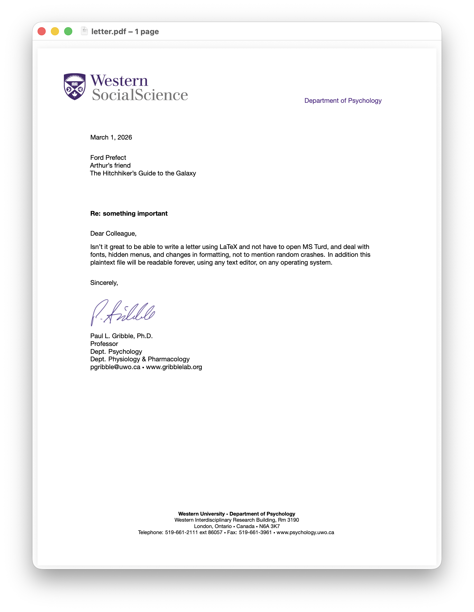 As a final example, some time ago I created a LaTeX style file that duplicates the official Western letterhead, so that I could easily write letters. As a result, I can write a letter like this: