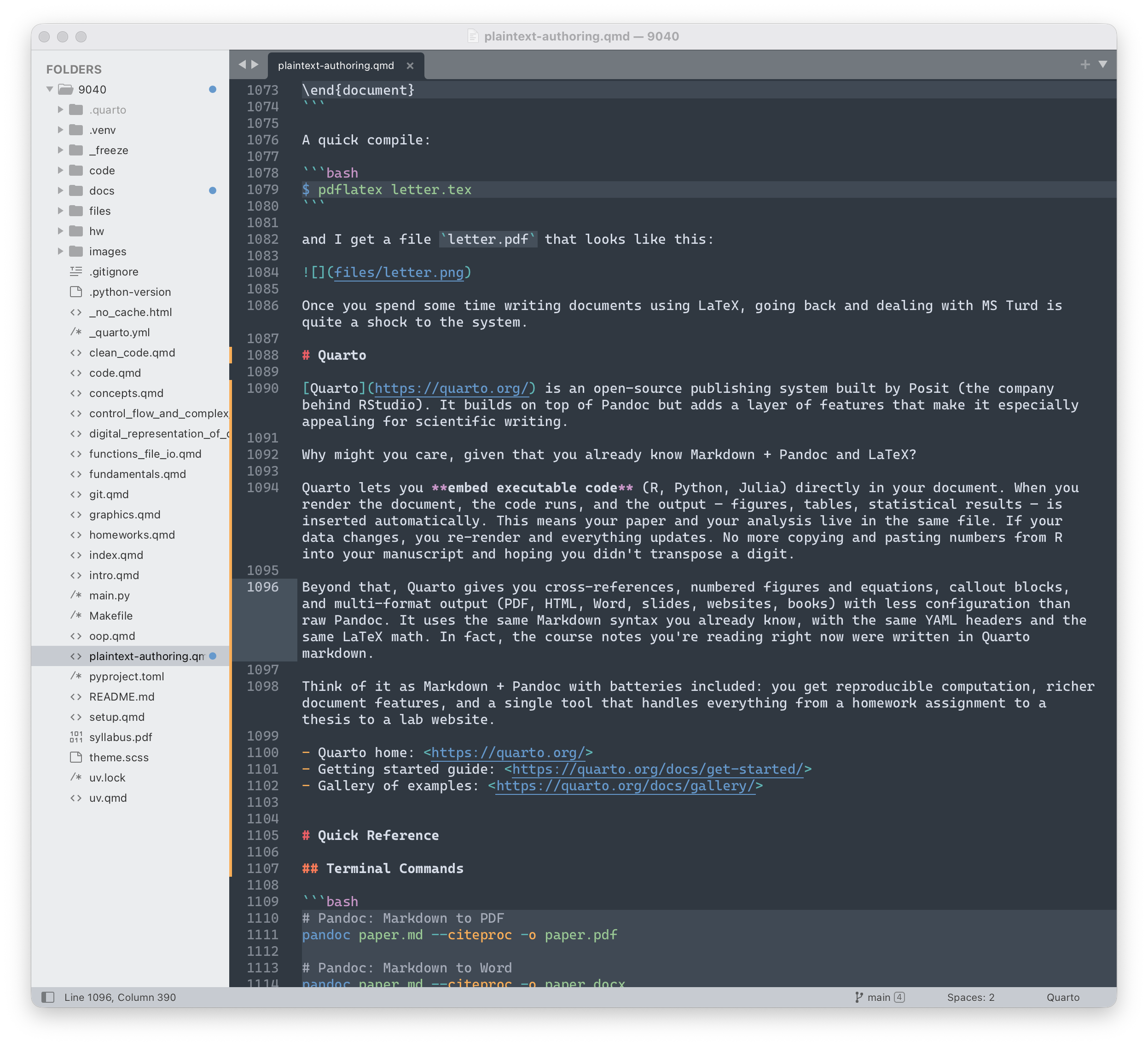 - YAML metadata blocks for title, author, date, and formatting options