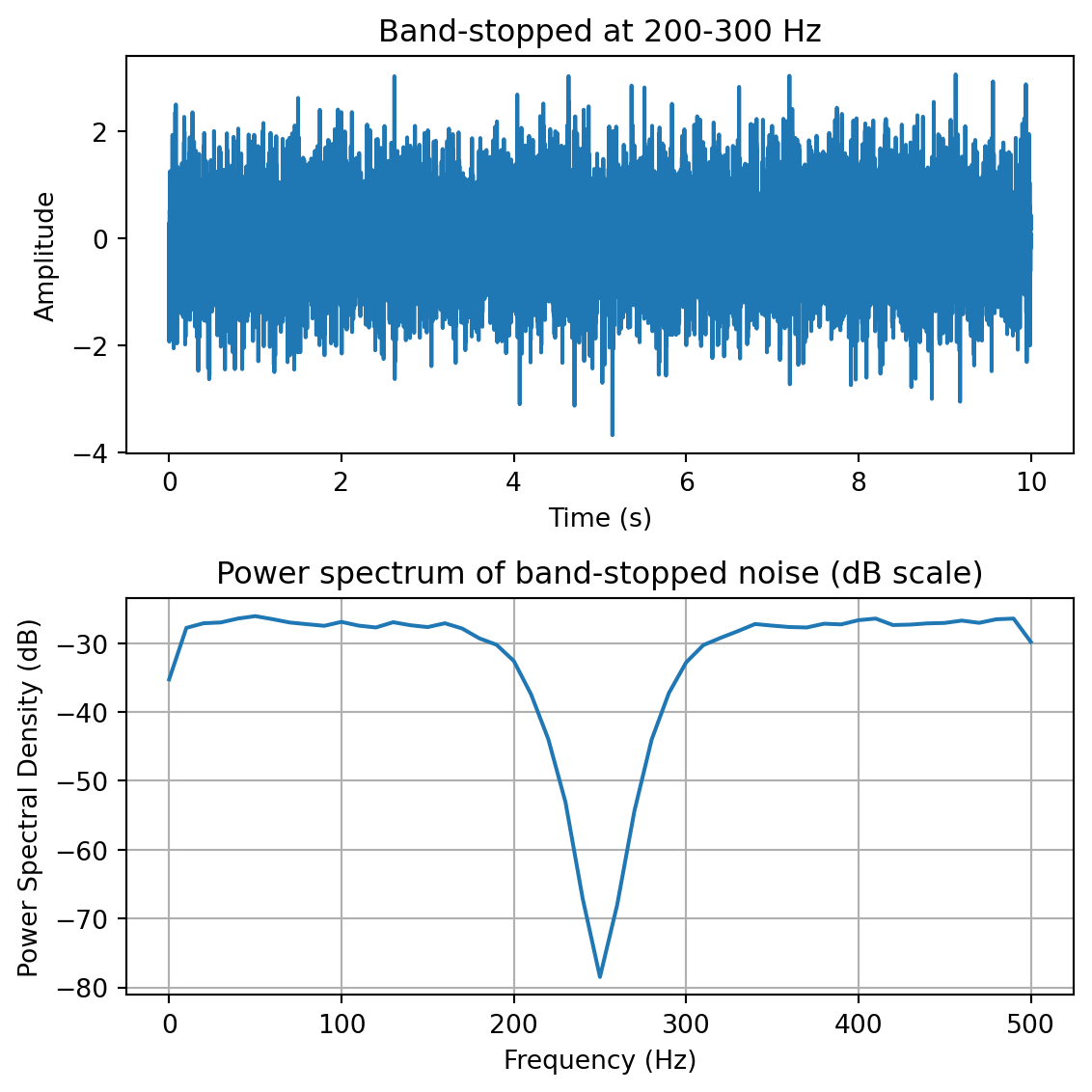 yf = plg_bandstop(y, fs, [200,300]) # band-stop filter at 200-300 Hzfreqs,psd = sp.signal.welch(yf,fs=fs,nperseg=100)fig,ax = plt.subplots(2,1, figsize=(6,6))ax[0].plot(t,yf)ax[0].set_xlabel('Time (s)')ax[0].set_ylabel('Amplitude')ax[0].set_title('Band-stopped at 200-300 Hz')ax[1].plot(freqs,10*np.log10(psd))ax[1].set_xlabel('Frequency (Hz)')ax[1].set_ylabel('Power Spectral Density (dB)')ax[1].set_title('Power spectrum of band-stopped noise (dB scale)')ax[1].grid()plt.tight_layout()