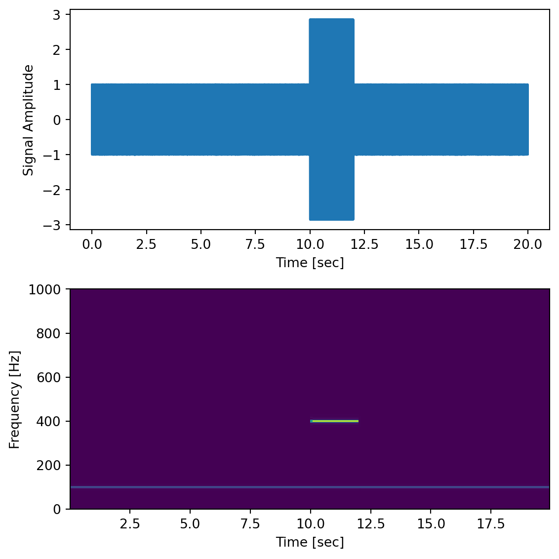 dt =0.0005time = np.arange(0.0, 20.0, dt)s1 = np.sin(2* np.pi *100* time)s2 =2* np.sin(2* np.pi *400* time)s2[time <=10] =0# zero out before 10 secs2[time >=12] =0# zero out after 12 sec (chirp only between 10-12 sec)nse =0.01* np.random.random(size=len(time)) # add some noise into the mixx = s1 + s2 + nse # the signalfig,ax = plt.subplots(2,1, figsize=(6,6))ax[0].plot(time, x)ax[0].set_xlabel('Time [sec]')ax[0].set_ylabel('Signal Amplitude')f, t_spec, Sxx = sp.signal.spectrogram(x, fs=1/dt, nfft=1024)ax[1].pcolormesh(t_spec, f, Sxx)ax[1].set_xlabel('Time [sec]')ax[1].set_ylabel('Frequency [Hz]')plt.tight_layout()