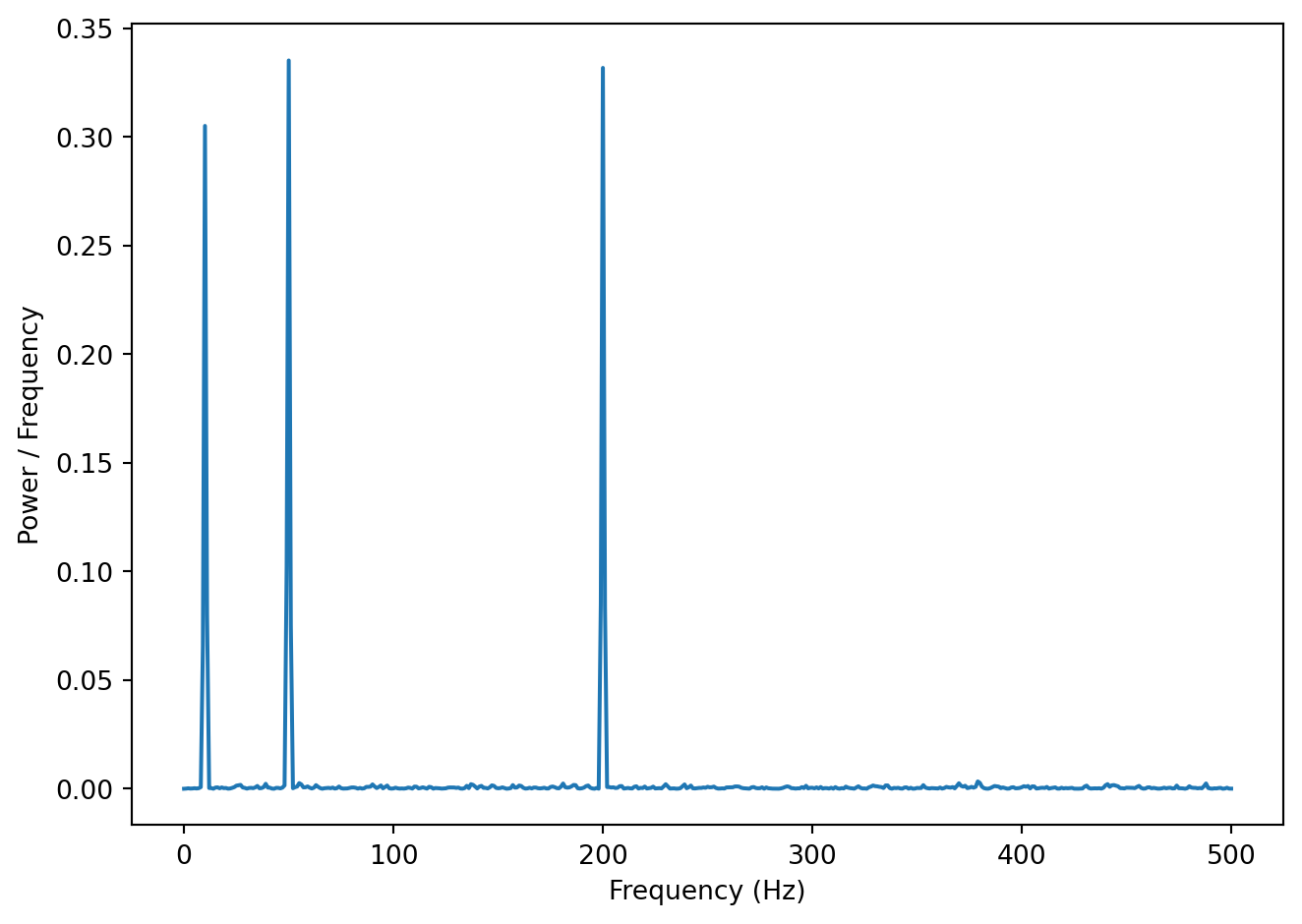Let’s look at a concrete example, a spectrum of a noisy signal with peaks at 10, 50 and 200 Hz.